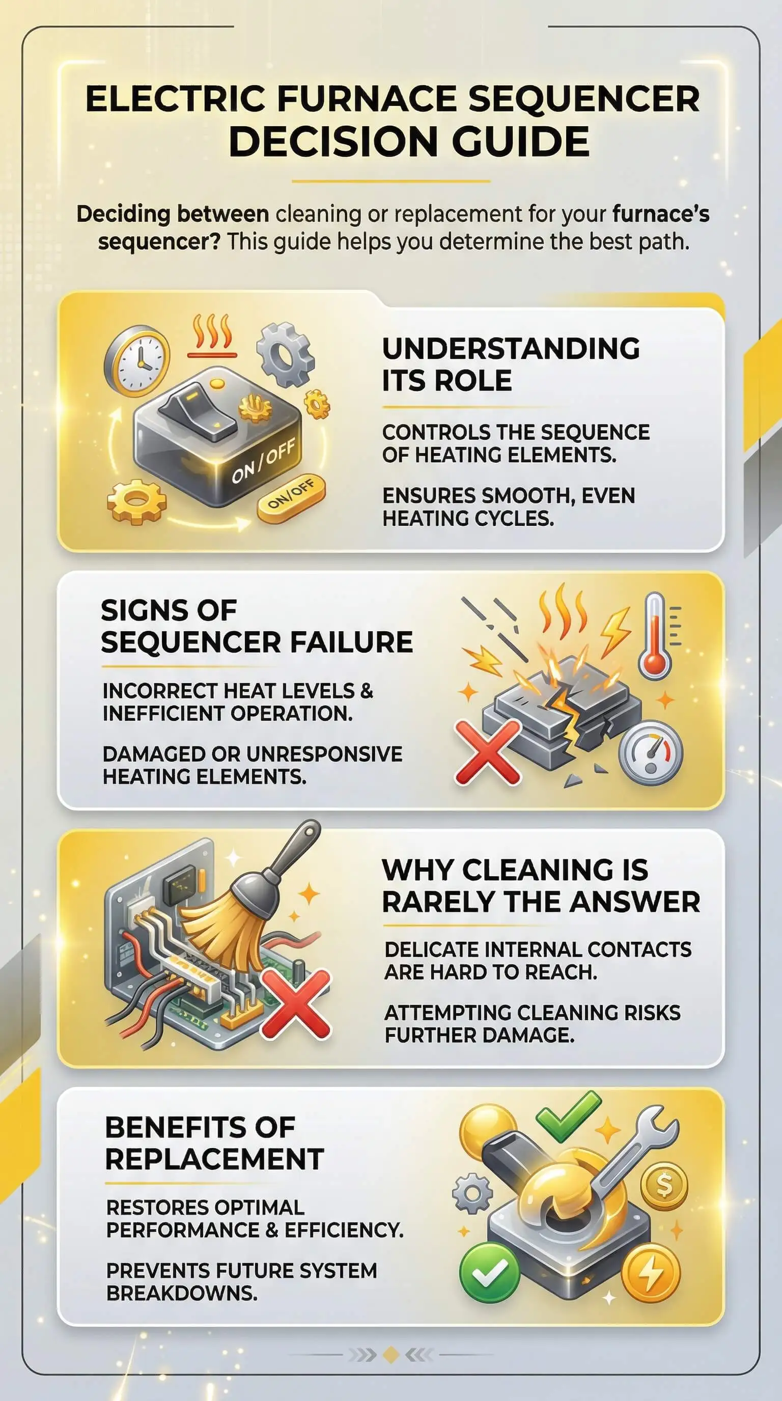 Replace before you clean. A faulty sequencer should be replaced in most cases — not cleaned. Sequencers degrade from the inside out. By the time symptoms appear, internal contacts or bimetal strips have already begun to fail. Cleaning cannot reverse that.