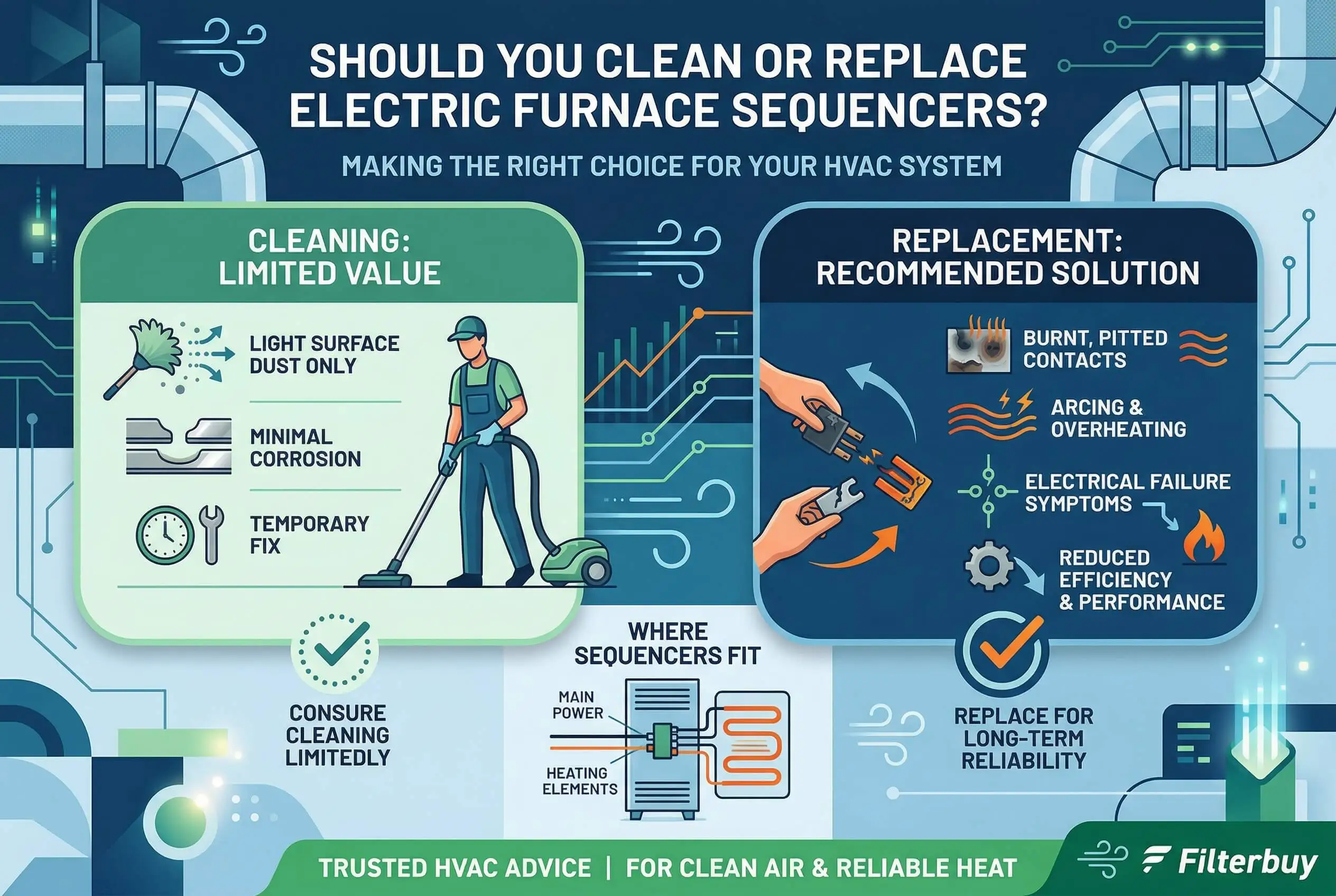 Sequencers typically cost between $10 and $30 per unit, making them one of the most affordable components in an electric furnace. Labor for a professional replacement generally runs $75 to $150 depending on your market. Given that cost, most homeowners are better served by replacing a suspect sequencer outright than spending time on cleaning that may only delay the inevitable by a few weeks or months.